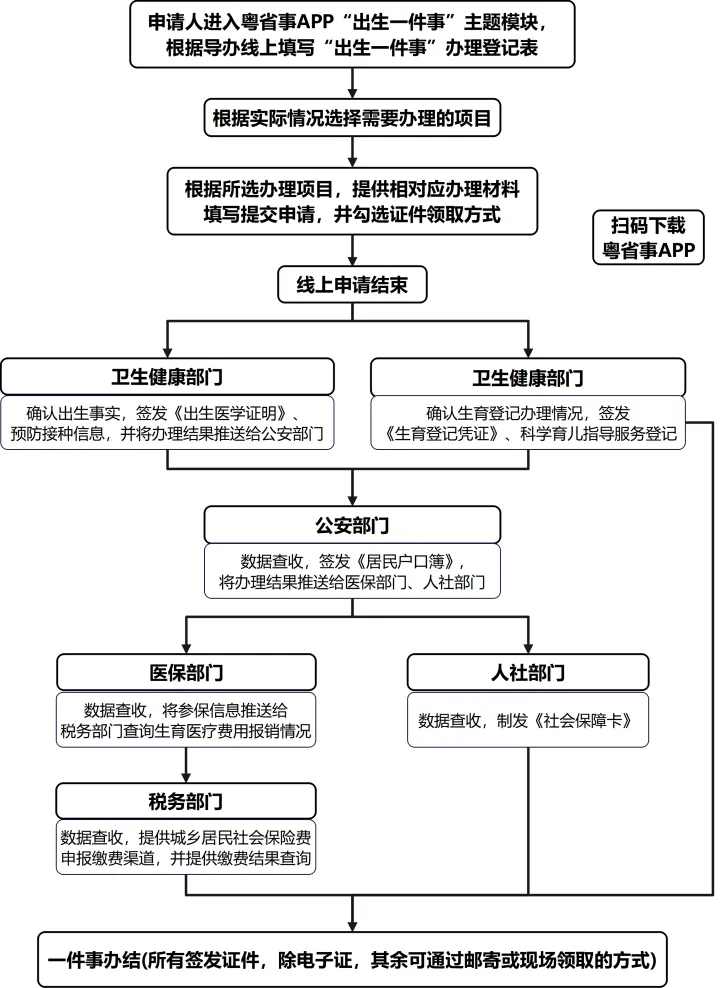 重生儿“汲引一件事”,即是让全国通过粤省事APP的“汲引一件事”线上央求,完成汲引医学阐明、国(境)内汲引登记、驻扎接种电子档案申领、城乡住户参保登记(基本医疗保障)社会保障卡申领、城乡住户基本医疗保障费呈报(重生儿医保缴费)、生养医疗用度报销、生养登记根据签发、科学育儿率领服务登记等九个事项一次性集成化办理。